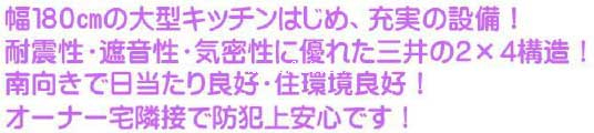 | ココがポイント | ★杉並区宮前4丁目 ★ローゼンハイム102 ★三井ホーム施工の2×4構造 ★防犯シャッター&ALSOK導入 ★オーナー様宅と一緒で安心o(^o^)o ★バストイレ別&独立洗面台付き ★ペアガラス&24時間換気システム ★自炊派にお薦めのシステムキッチン ★いつも綺麗なアパートです |
